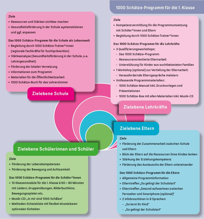 Das 1000 Schätze-Programm greift den modernen ressourcenorientierten Ansatz auf, der sich nicht auf die Risiken und Probleme konzentriert, sondern vor allem auf das Erkennen und den Ausbau vorhandener Stärken.