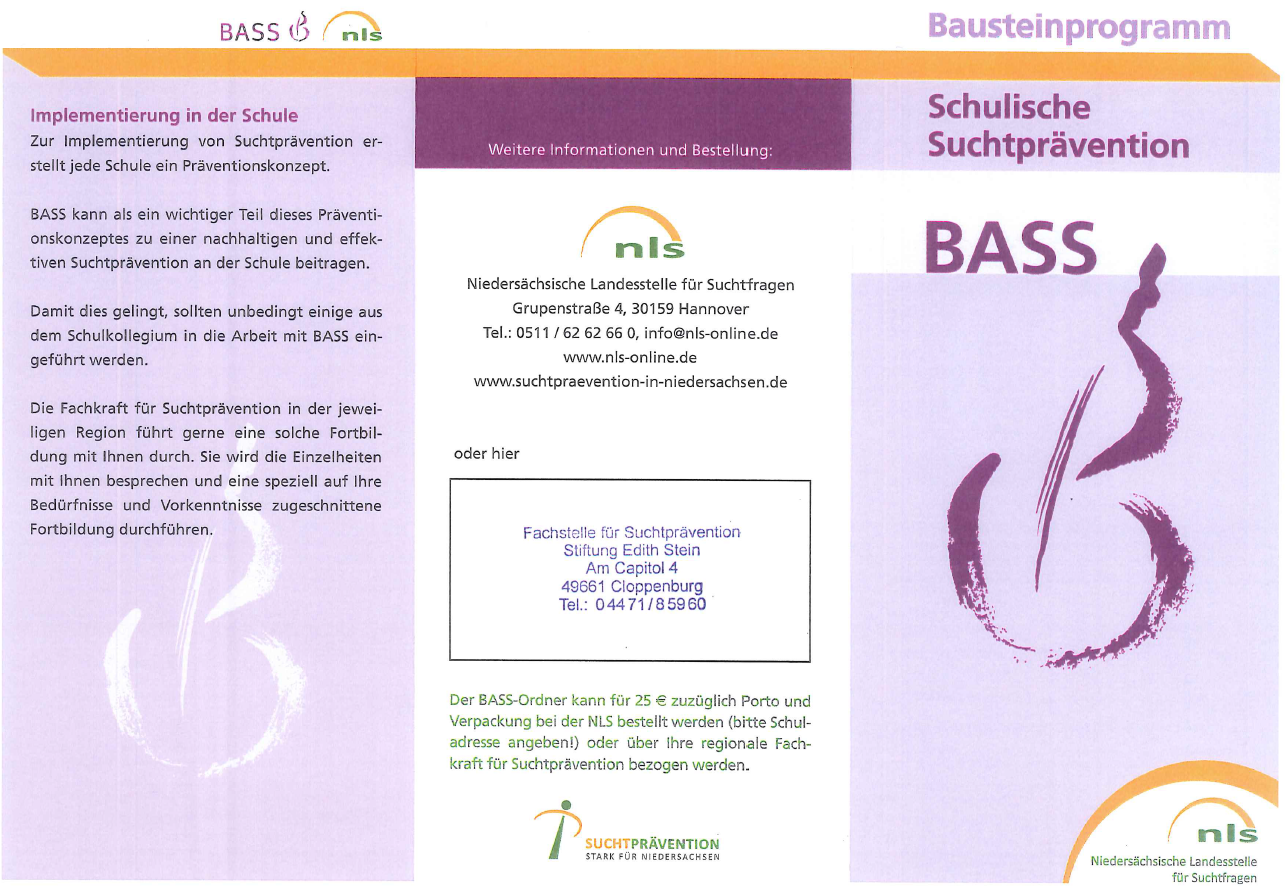 BASS (Bausteinprogramm Schulische Suchtvorbeugung) wurde für die Sekundarstufe 1 an allen allgemeinbildenden Schulen entwickelt. Mit diesem Bausteinprogramm haben Schulen die Möglichkeit, Suchtprävention in der Schule durchzuführen. 2015 wurde das Programm komplett überarbeitet und ergänzt.